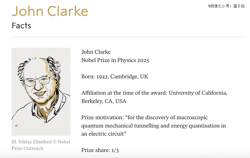 John Clarke1942年出生于英国剑桥,1964年、1968年分别获得剑桥大学基督学院和达尔文学院的物理学学士、硕士和博士学位,2003年获得剑桥大学理学博士学位。