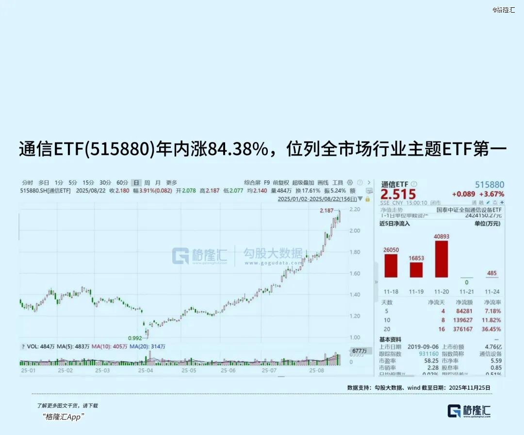 资金也在持续净流入。Wind数据显示,截至11月24日,通信ETF(515880)本月净流入15.01亿元,年内净流入达76.88亿元,最新规模为118.87亿元,规模位居同类首位,年内规模增幅超过380%。