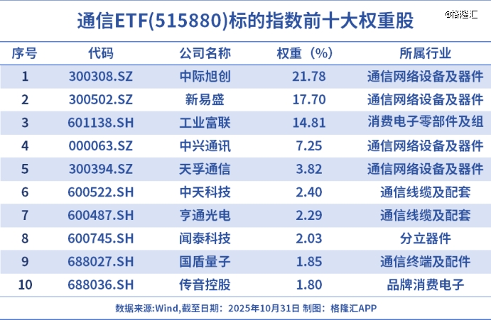 通信ETF(515880)所跟踪的通信设备指数中,“光模块+服务器+铜连接+光纤”合计权重占比超过81%,其中光模块独占52%,服务器占比达22%;在前十大重仓股中,“易中天”(新易盛、中际旭创、天孚通信)合计占比超过43%。